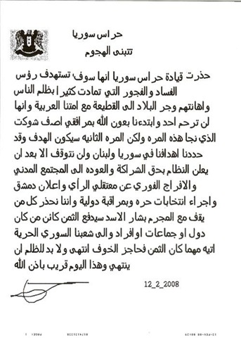 They are saying in their letter that they were targeting Assef Shawqat yet he survived the attack where as his two companions were hit ,there is no mention for Imad, still may be something happened secretly to Assef Shawqat who knows . It is interesting to see the Hawk I guess on the page , it is like a military official group ,I mean inside the army , also the language used ,it is starting with "The leadership of Syria's guards had warned" as if there is a previous warning. It is unique statement because for the first time we do not have a religious militant group , it seems to me as a secular as it did not start with "Basmallah" yet it ended the letter with "Bazanallah" . They are calling for a civilian state ,free elections with international monitoring , the freedom for the political prisoners .