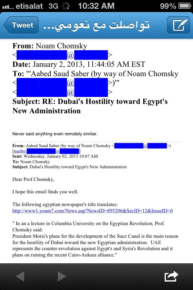 I can not believe that I will spend my time denying and repeating that Professor Noam Chomsky did not speak about Egypt and UAE in the so-called lecture in Columbia University from two days ago as spread by Muslim brotherhood media !!