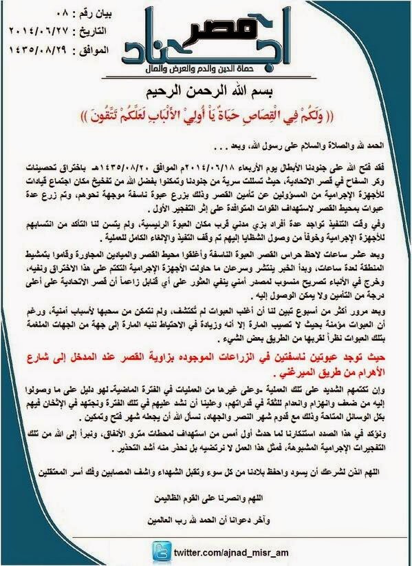 - Interestingly enough "Ajnad Misr" published a statement on Friday "27.6.2014" stating its responsibility on its official for the explosive bomb in Heliopolis court warning civilians that that they set up other explosive devices in other places including none other than the premise of the Presidential Palace in Heliopolis. The militant group interestingly even highlighted the exact location of the bombs they planted nearby the Presidential Palace in red bold font !!